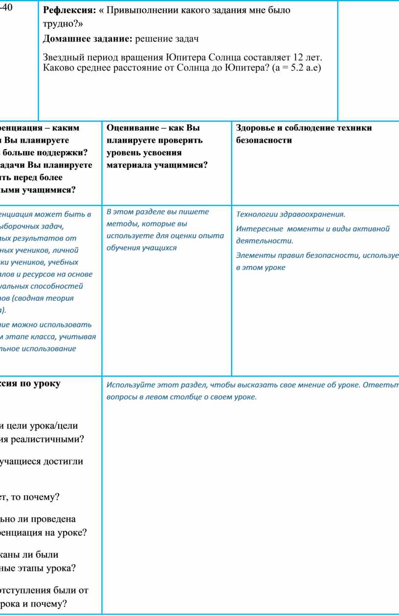 Рефлексия: « Привыполнении какого задания мне было трудно?» Домашнее задание: решение задач Звездный период вращения Юпитера Солнца составляет 12 лет. Каково среднее расстояние от Солнца до Юпитера? (a = 5.2 a.е)