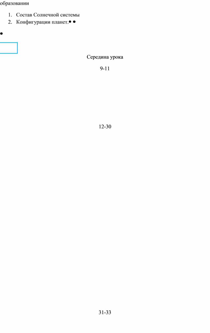 2.Проверка домашнего задания Ответы на вопросы в начале урока и напоминание о предыдущем образовании 1. Состав Солнечной системы 2. Конфигурации планет. |