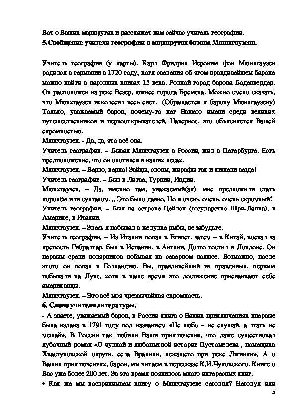 5.Сообщение учителя географии о маршрутах барона Мюнхгаузена.