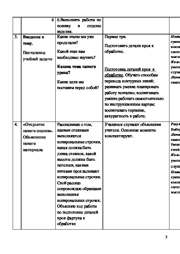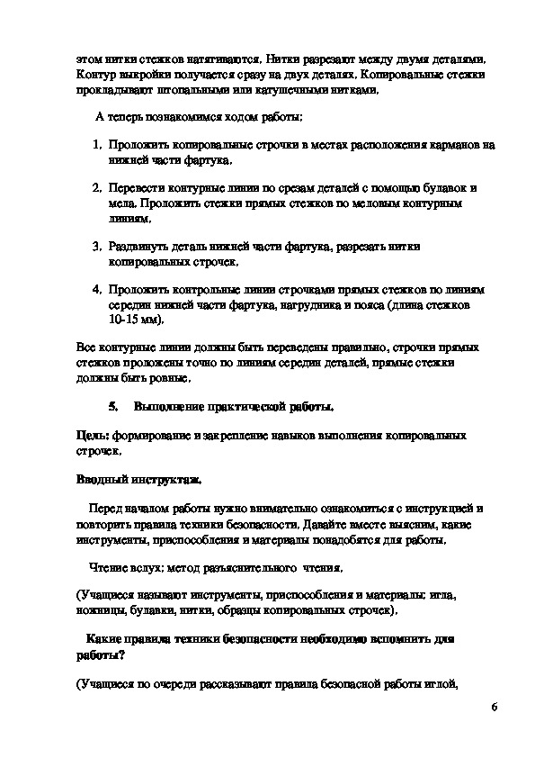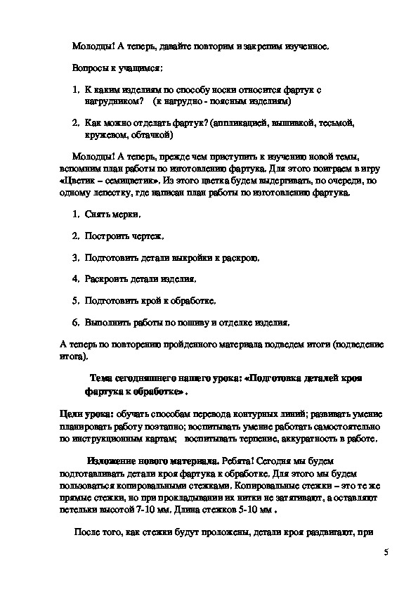 Воспитательные: воспитывать умение работать самостоятельно по инструкционным картам; воспитывать терпение, аккуратность в работе, усидчивость, интерес к выполняемой работе, добиваться правильной организации рабочего места. Конспект урока "Подготовка деталей кроя фартука к обработке" 5 класс