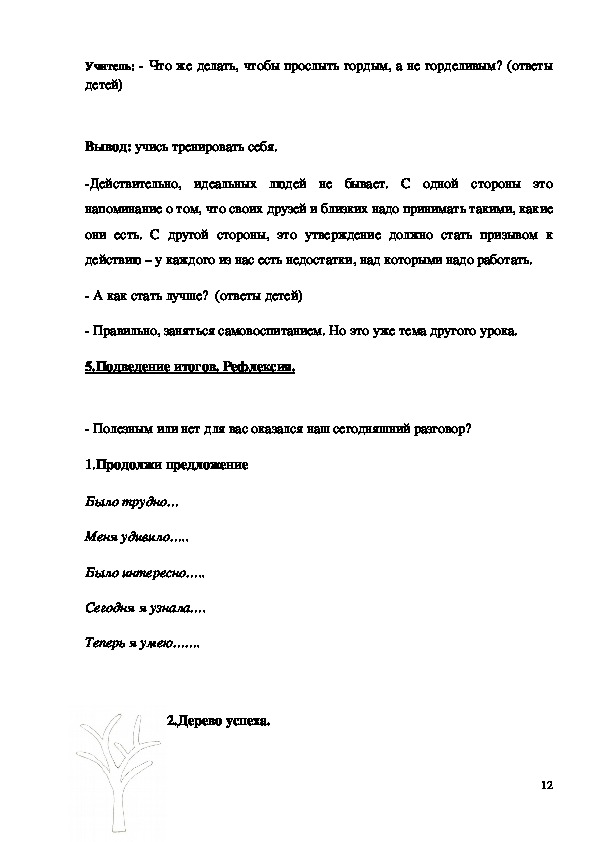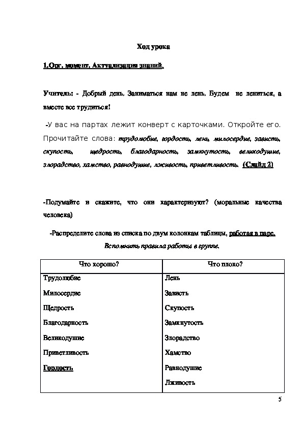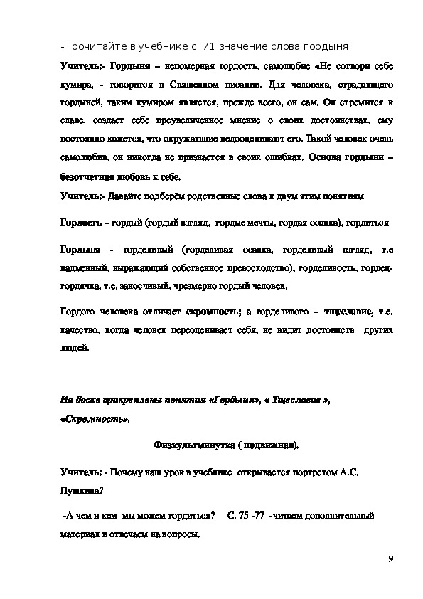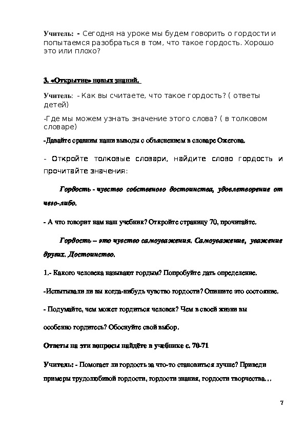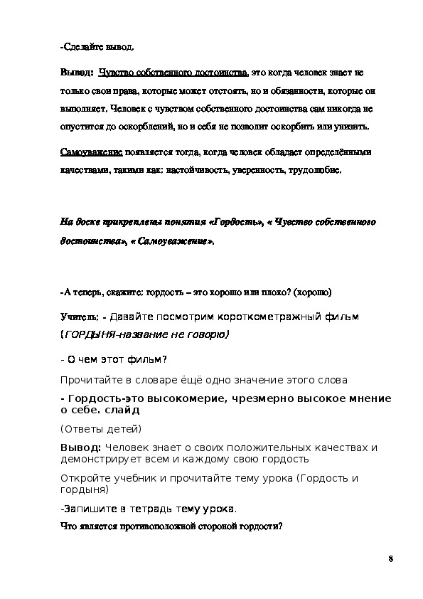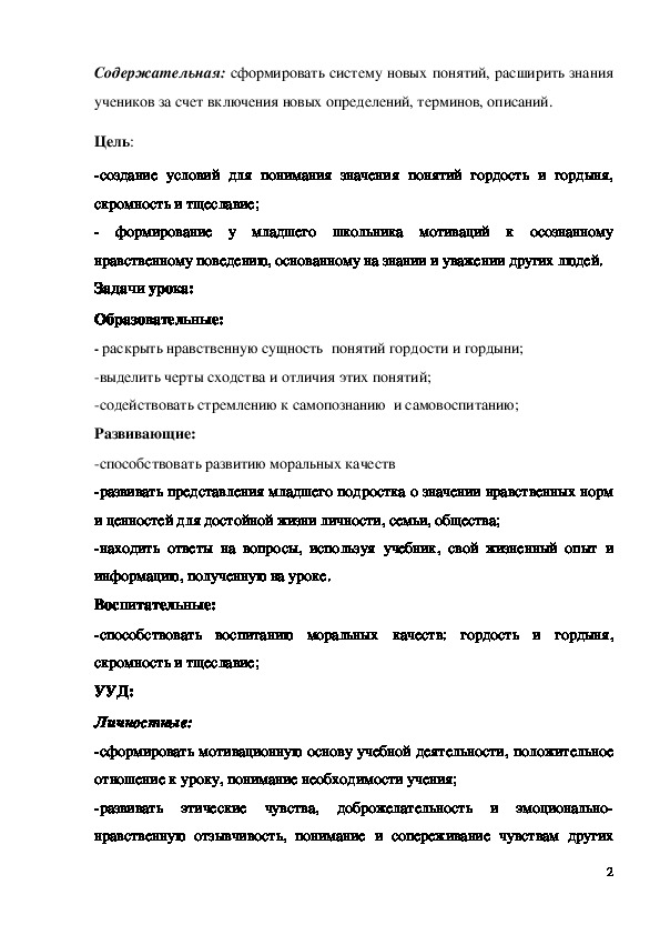 - формирование у младшего школьника мотиваций к осознанному нравственному поведению, основанному на знании и уважении других людей. Методическая разработка урока "Гордость и гордыня" 4 класс