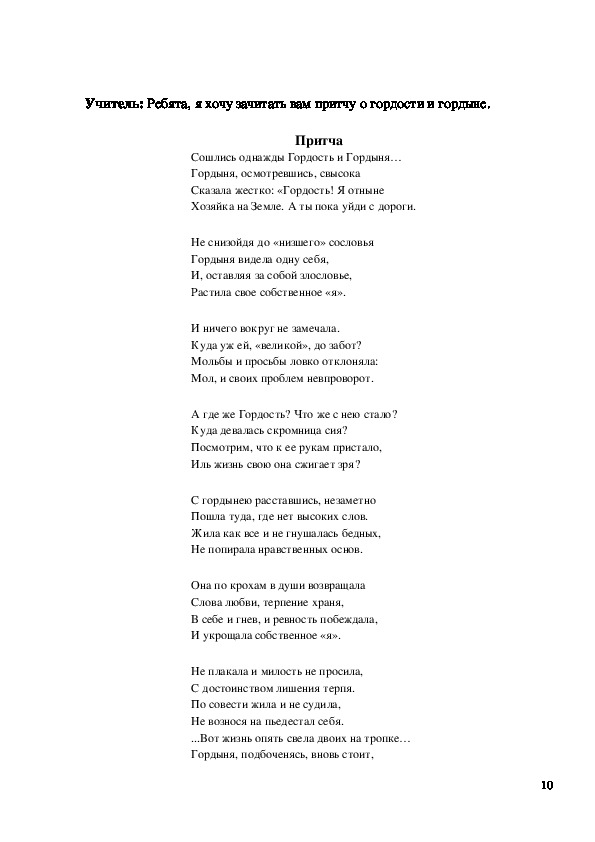 9Учитель: Ребята, я хочу зачитать вам притчу о гордости и гордыне.