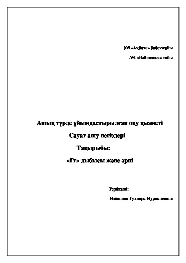 Болашаққа бағдар:рухани жаңғыруды сипаттау және патриоттық сананы ынталандыратын ұлттық құндылықтарды жаңғырту.Балалардың бойына ұлттық сананы ояту және халқына деген құрмет, мақтаныш сезімін ұялату,ұлттық рухты сіңіру. Балаларды « Ғ» әрпімен таныстыру. «Ғ» әрпі бар сөздерге дыбыстық талдау жасай білуді үйрету. « Ғ» әрпі айтылу артикуляциясына мән беріп, бас әрпі,кіші әрпі жазылуын үйрету, буын туралы түсінігін молайту.Ғ әрпі ашық сабақ