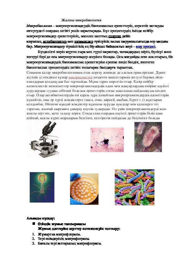 (микрос – кішкене, майда, биос – тіршілік, логос – ғылым). Жалпы микробиология –