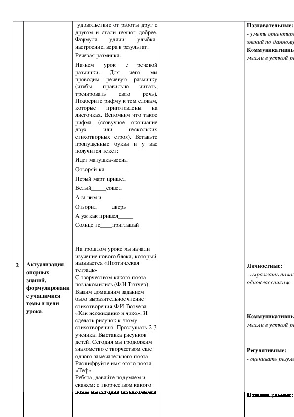 Цель урока: формирование образовательных компетенций: информационных, коммуникативных, креативных, рефлексивных, обучающимися 4 класса в предметной области «Литературное чтение» по теме: А.А.Фет «Весенний дождь», «Бабочка»