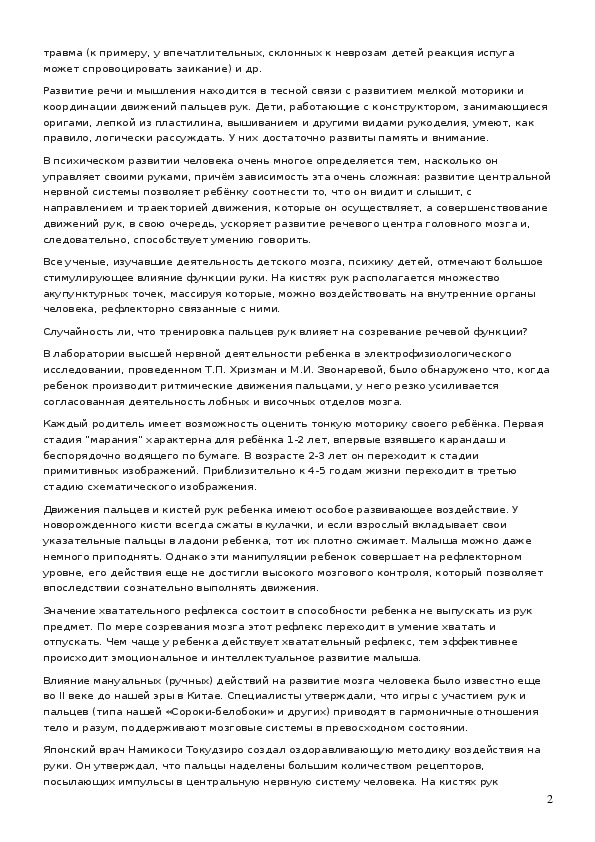 движений рук, в свою очередь, ускоряет развитие речевого центра головного мозга и,