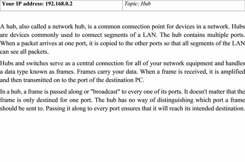 A hub, also called a network hub, is a common connection point for devices in a network. Hubs are devices commonly used to connect segments of a LAN. The hub contains multiple ports. When a packet arrives at one port, it is copied to the other ports so that all segments of the LAN can see all packets.