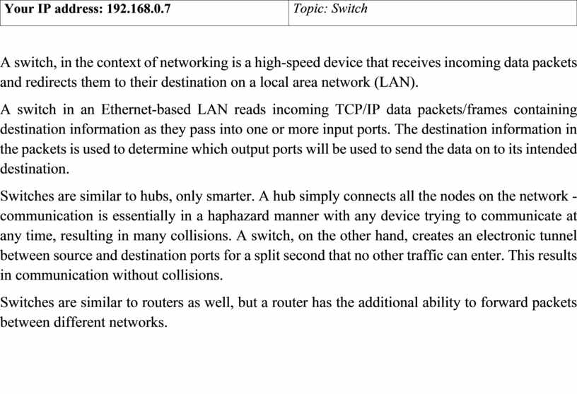 Switches are similar to hubs, only smarter. A hub simply connects all the nodes on the network - communication is essentially in a haphazard manner with any device trying to communicate at any time, resulting in many collisions. A switch, on the other hand, creates an electronic tunnel between source and destination ports for a split second that no other traffic can enter. This results in communication without collisions.