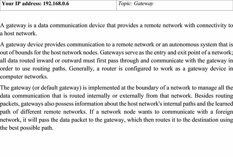 A gateway device provides communication to a remote network or an autonomous system that is out of bounds for the host network nodes. Gateways serve as the entry and exit point of a network; all data routed inward or outward must first pass through and communicate with the gateway in order to use routing paths. Generally, a router is configured to work as a gateway device in computer networks.