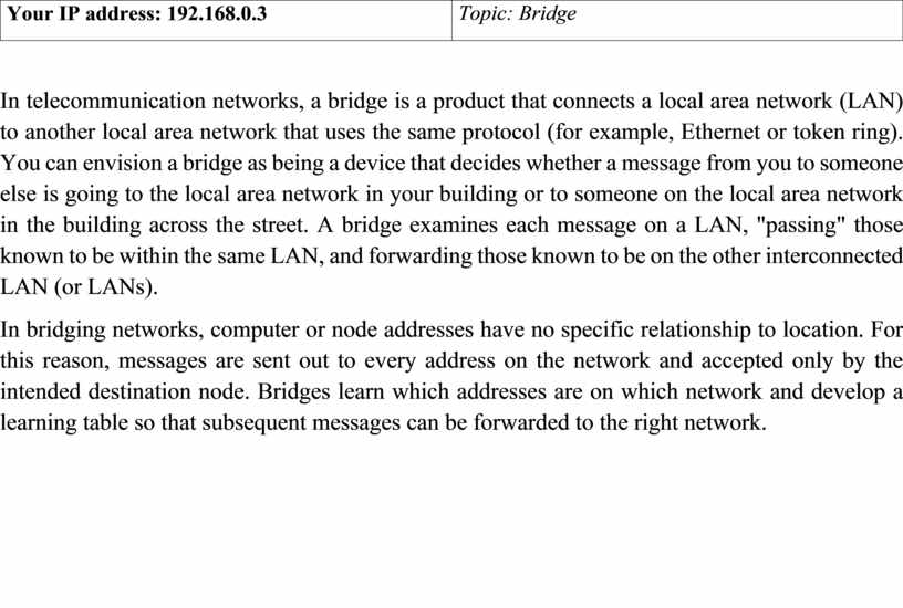 In telecommunication networks, a bridge is a product that connects a local area network (LAN) to another local area network that uses the same protocol (for example, Ethernet or token ring). You can envision a bridge as being a device that decides whether a message from you to someone else is going to the local area network in your building or to someone on the local area network in the building across the street. A bridge examines each message on a LAN, "passing" those known to be within the same LAN, and forwarding those known to be on the other interconnected LAN (or LANs).