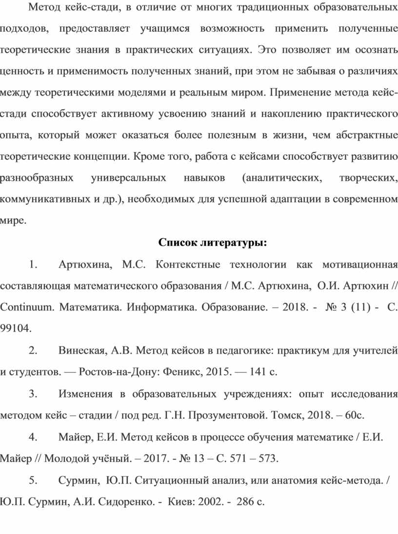 2. Винеская, А.В. Метод кейсов в педагогике: практикум для учителей и студентов. — Ростов-на-Дону: Феникс, 2015. — 141 с.