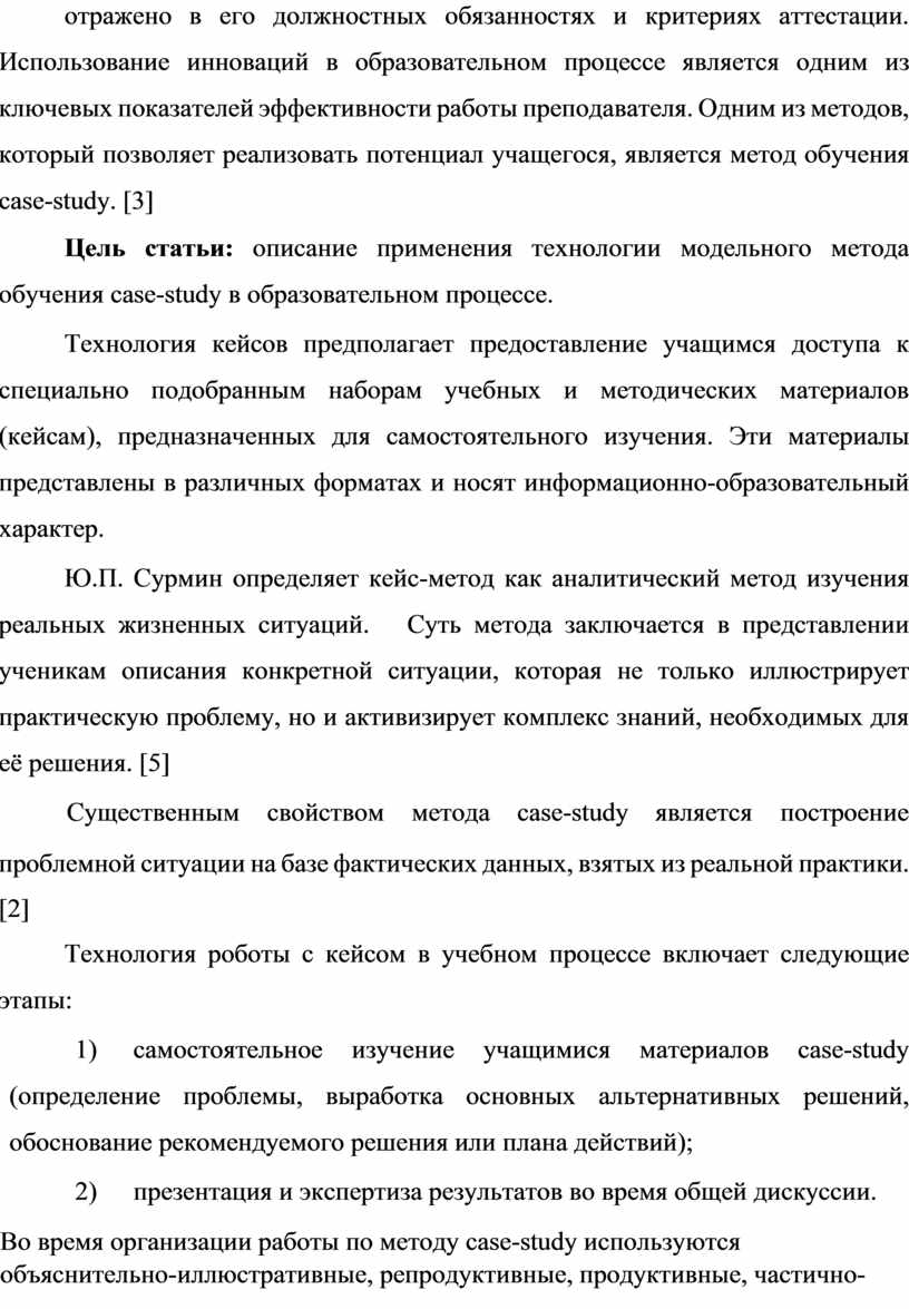 Современный педагог должен обладать глубоким пониманием широкого спектра современных инновационных технологий и подходов в сфере образования. Владение обширным арсеналом образовательных технологий стало неотъемлемой частью профессиональной компетентности педагога, что отражено в его должностных обязанностях и критериях аттестации. Использование инноваций в образовательном процессе является одним из ключевых показателей эффективности работы преподавателя. Одним из методов, который позволяет реализовать потенциал учащегося, является метод обучения case-study. [3]