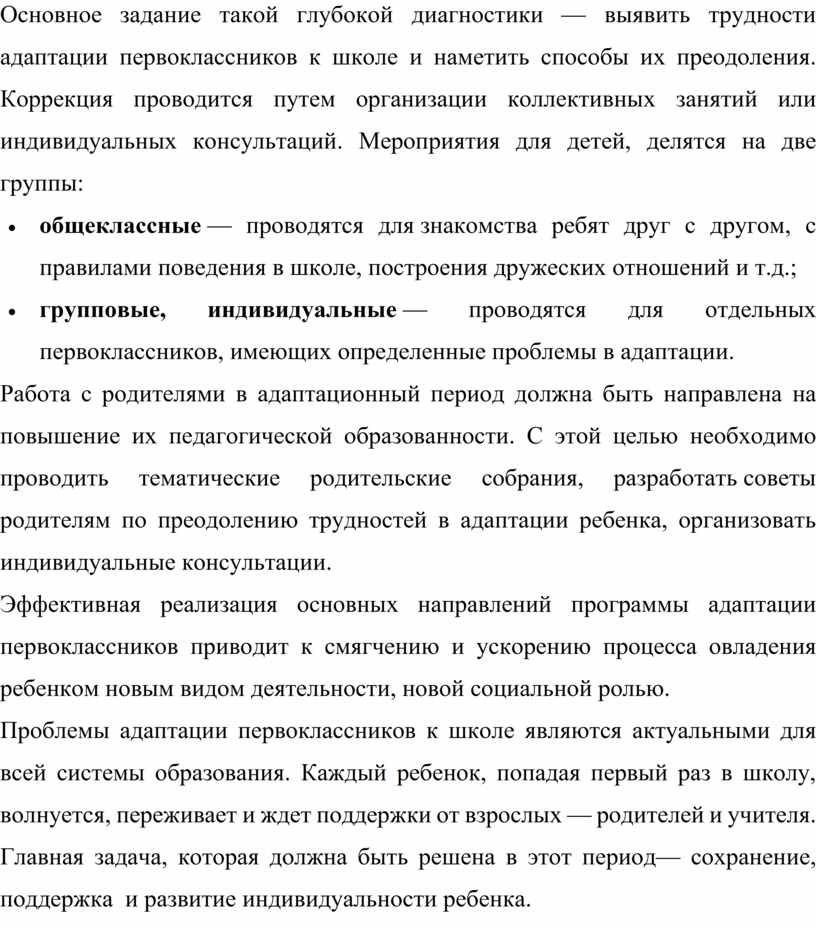 Основное задание такой глубокой диагностики — выявить трудности адаптации первоклассников к школе и наметить способы их преодоления. Коррекция проводится путем организации коллективных занятий или индивидуальных консультаций. Мероприятия для детей, делятся на две группы: