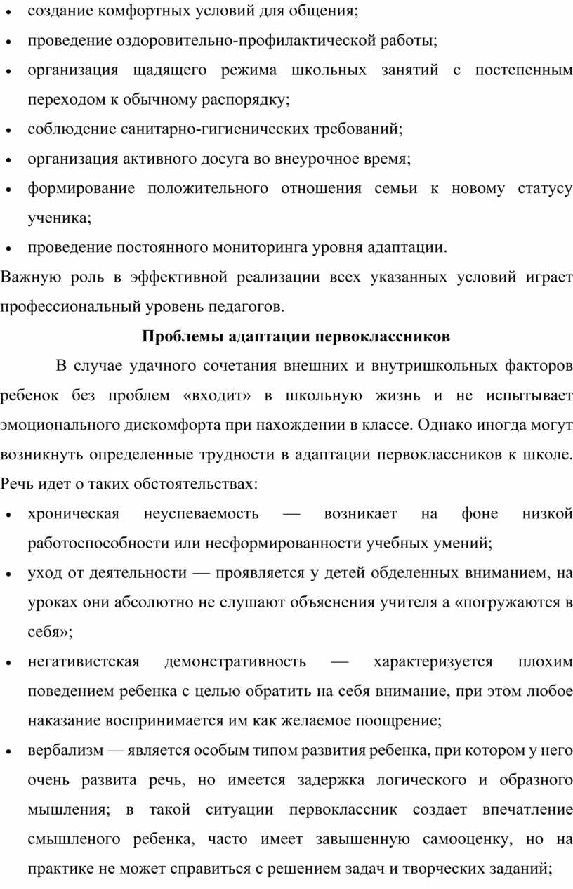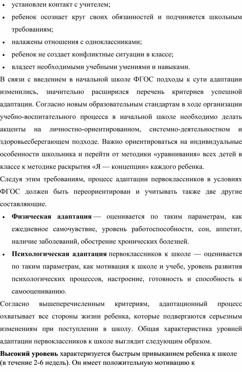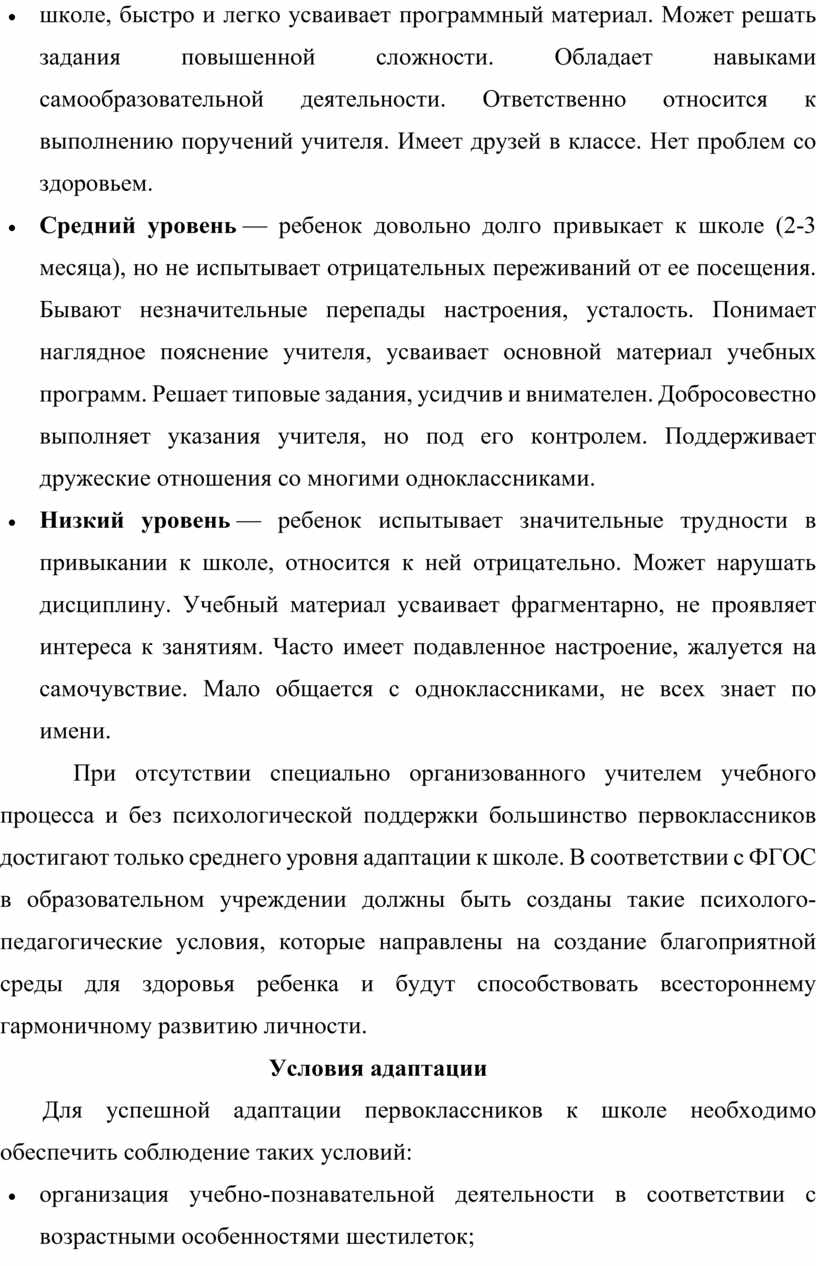 При отсутствии специально организованного учителем учебного процесса и без психологической поддержки большинство первоклассников достигают только среднего уровня адаптации к школе. В соответствии с ФГОС в образовательном учреждении должны быть созданы такие психолого-педагогические условия, которые направлены на создание благоприятной среды для здоровья ребенка и будут способствовать всестороннему гармоничному развитию личности.