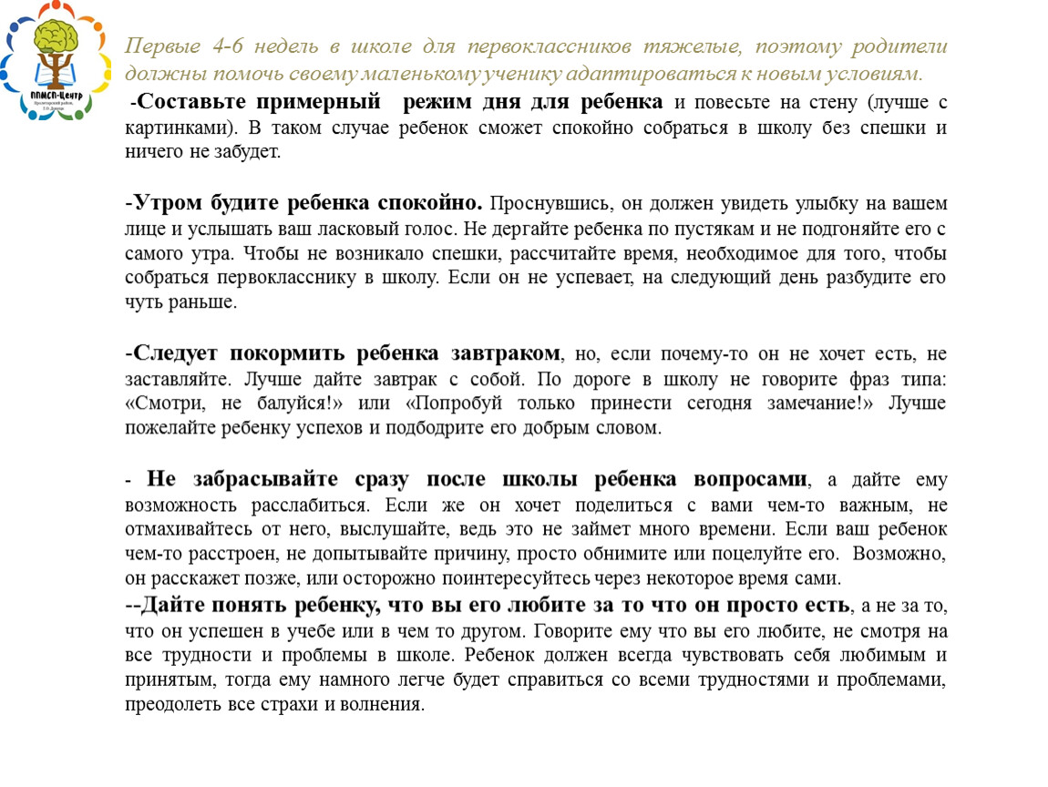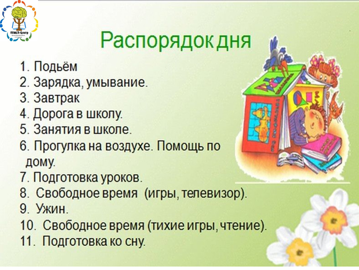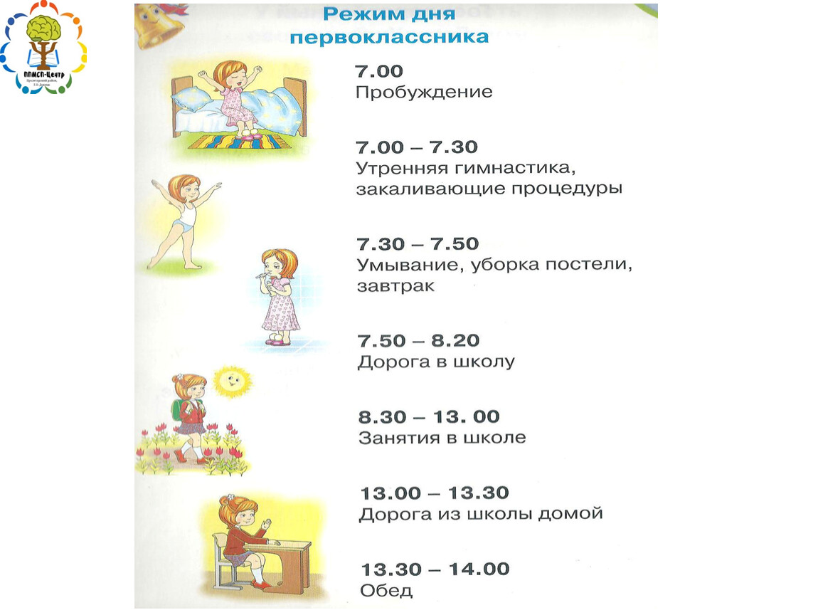 -Составьте примерный режим дня для ребенка и повесьте на стену (лучше с картинками). В таком случае ребенок сможет спокойно собраться в школу без спешки и ничего не забудет.