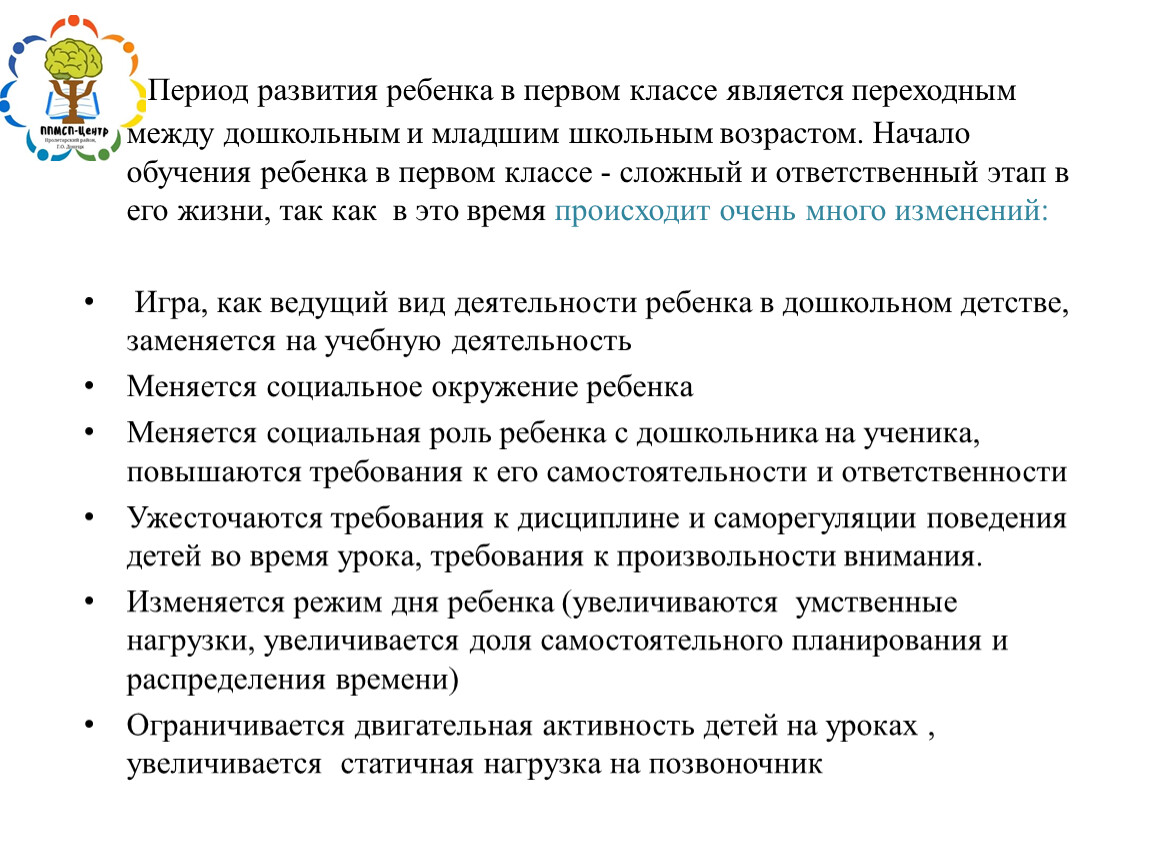 Период развития ребенка в первом классе является переходным между дошкольным и младшим школьным возрастом. Начало обучения ребенка в первом классе - сложный и ответственный этап в его жизни, так как в это время происходит очень много изменений:
