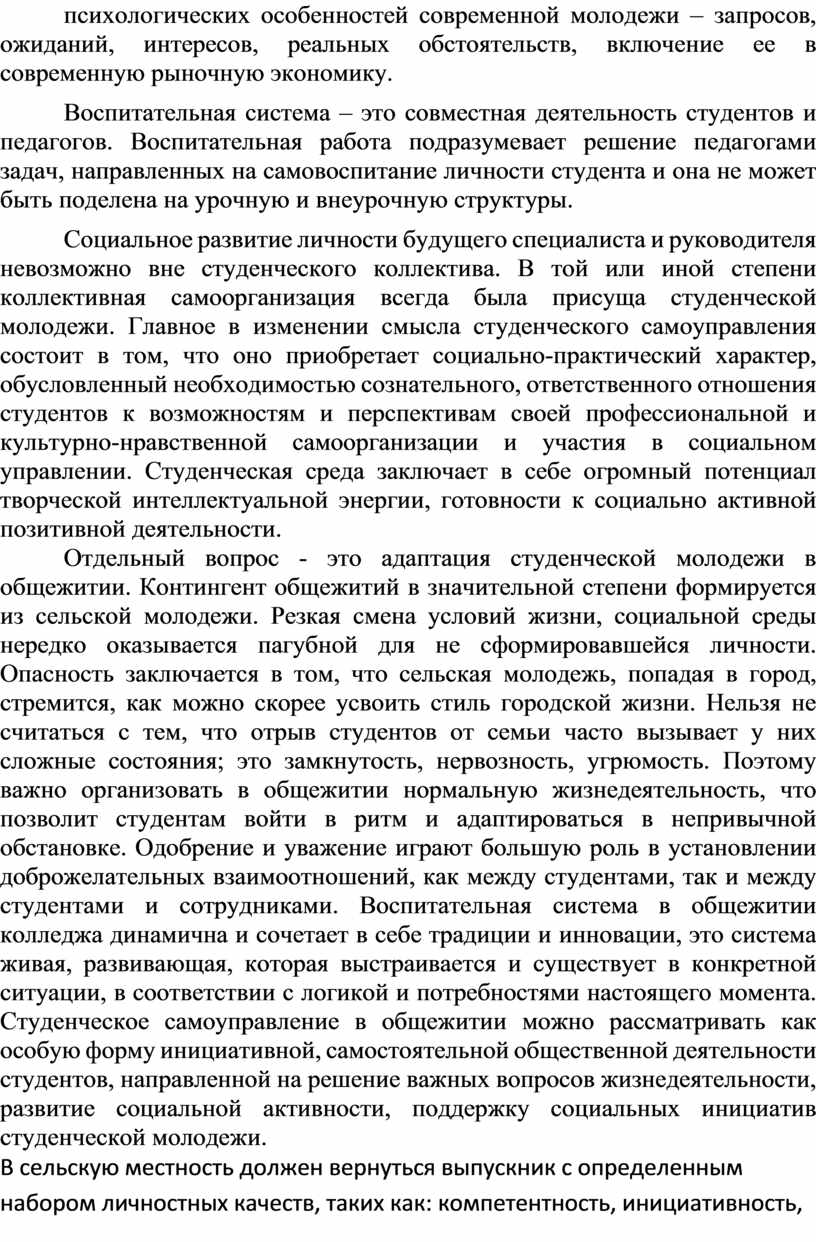 Отдельный вопрос - это адаптация студенческой молодежи в общежитии. Контингент общежитий в значительной степени формируется из сельской молодежи. Резкая смена условий жизни, социальной среды нередко оказывается пагубной для не сформировавшейся личности. Опасность заключается в том, что сельская молодежь, попадая в город, стремится, как можно скорее усвоить стиль городской жизни. Нельзя не считаться с тем, что отрыв студентов от семьи часто вызывает у них сложные состояния; это замкнутость, нервозность, угрюмость. Поэтому важно организовать в общежитии нормальную жизнедеятельность, что позволит студентам войти в ритм и адаптироваться в непривычной обстановке. Одобрение и уважение играют большую роль в установлении доброжелательных взаимоотношений, как между студентами, так и между студентами и сотрудниками. Воспитательная система в общежитии колледжа динамична и сочетает в себе традиции и инновации, это система живая, развивающая, которая выстраивается и существует в конкретной ситуации, в соответствии с логикой и потребностями настоящего момента. Студенческое самоуправление в общежитии можно рассматривать как особую форму инициативной, самостоятельной общественной деятельности студентов, направленной на решение важных вопросов жизнедеятельности, развитие социальной активности, поддержку социальных инициатив студенческой молодежи.