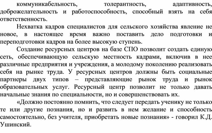 Создание ресурсных центров на базе СПО позволит создать единую сеть, обеспечивающую сельскую местность кадрами, включив в нее различные предприятия и учреждения, а молодому поколению реализовать себя на рынке труда. У ресурсных центров должны быть социальные партнеры двух типов – представляющие рынок труда и рынок образовательных услуг. Ресурсный центр позволит не только давать начальные знания по специальности, но и совершенствовать их.