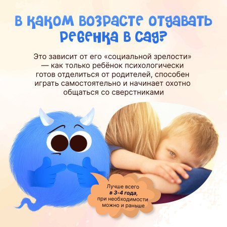 Детский сад-это важный этап в развитии социальных навыков ребёнка. Там он учится общаться со сверстниками, постигает азы счета и чтения, учится самостоятельности и дисциплине. Вот только вашему крохе вся эта польза пока ещё неведома. Всё что он сейчас знает это то, что мамы рядом не будет, вокруг много незнакомых людей и предметов. В новой обстановке малыши теряются и получают огромный стресс. Нужно малышу освоиться в детском саду и тогда он сможет легче привыкнуть к новой обстановке.
