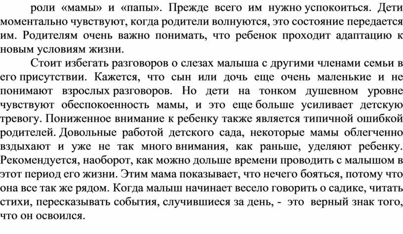 Стоит избегать разговоров о слезах малыша с другими членами семьи в его присутствии. Кажется, что сын или дочь еще очень маленькие и не понимают взрослых разговоров. Но дети на тонком душевном уровне чувствуют обеспокоенность мамы, и это еще больше усиливает детскую тревогу. Пониженное внимание к ребенку также является типичной ошибкой родителей. Довольные работой детского сада, некоторые мамы облегченно вздыхают и уже не так много внимания, как раньше, уделяют ребенку. Рекомендуется, наоборот, как можно дольше времени проводить с малышом в этот период его жизни. Этим мама показывает, что нечего бояться, потому что она все так же рядом. Когда малыш начинает весело говорить о садике, читать стихи, пересказывать события, случившиеся за день, - это верный знак того, что он освоился.