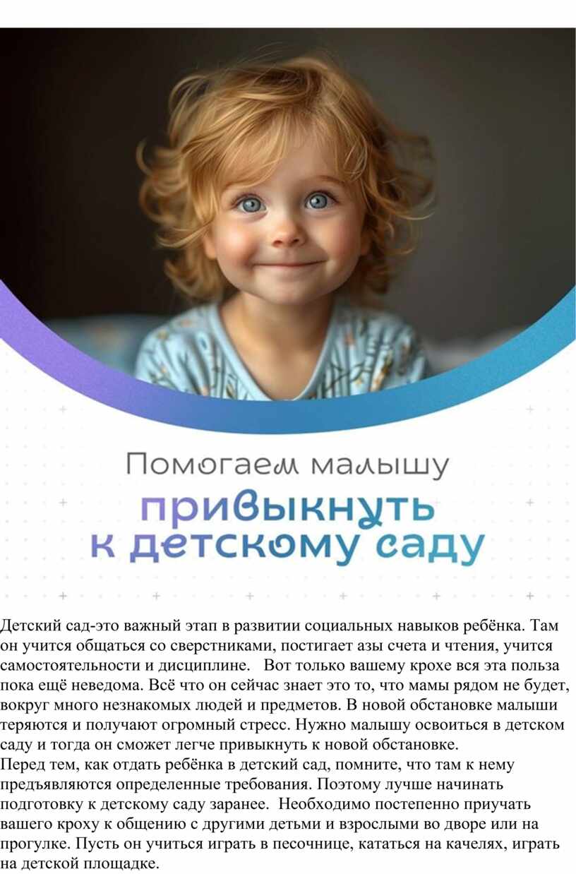 Перед тем, как отдать ребёнка в детский сад, помните, что там к нему предъявляются определенные требования. Поэтому лучше начинать подготовку к детскому саду заранее. Необходимо постепенно приучать вашего кроху к общению с другими детьми и взрослыми во дворе или на прогулке. Пусть он учиться играть в песочнице, кататься на качелях, играть на детской площадке.