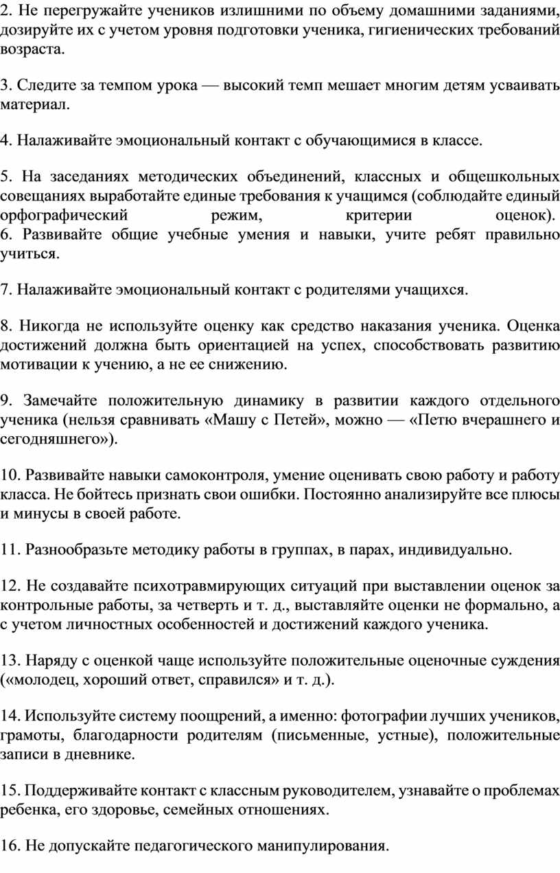 12. Не создавайте психотравмирующих ситуаций при выставлении оценок за контрольные работы, за четверть и т. д., выставляйте оценки не формально, а с учетом личностных особенностей и достижений каждого ученика.