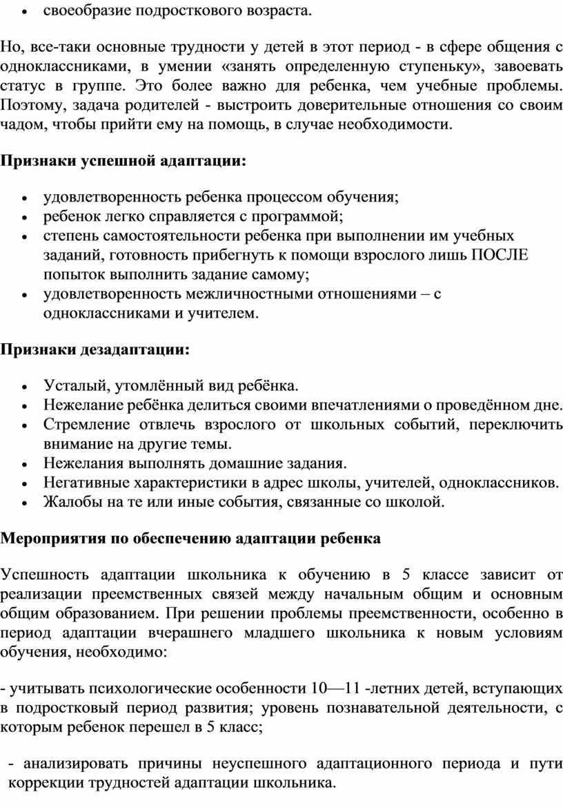 Успешность адаптации школьника к обучению в 5 классе зависит от реализации преемственных связей между начальным общим и основным общим образованием. При решении проблемы преемственности, особенно в период адаптации вчерашнего младшего школьника к новым условиям обучения, необходимо:
