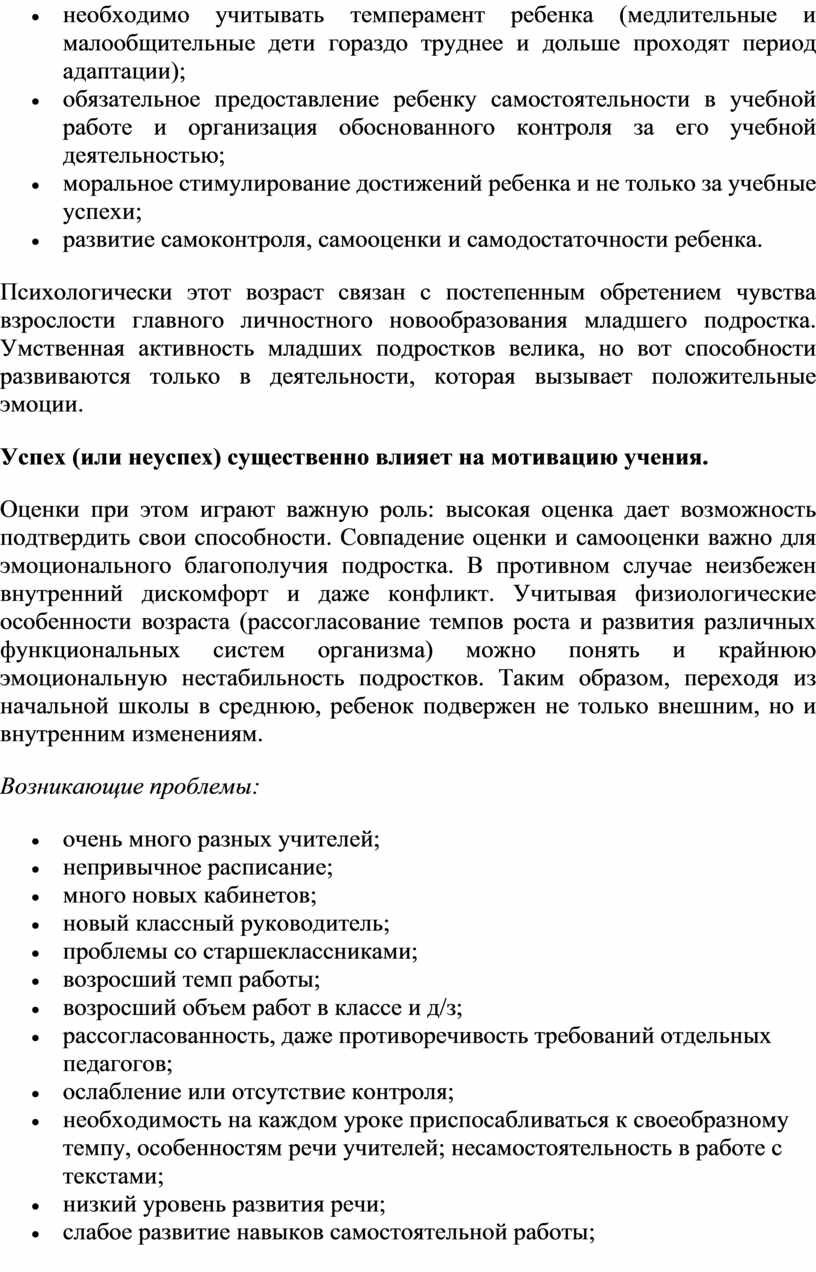 - учитывать психологические особенности 10—11 -летних детей, вступающих в подростковый период развития; уровень познавательной деятельности, с которым ребенок перешел в 5 класс;