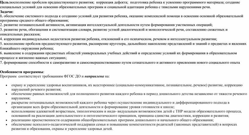 Цель:восполнение пробелов предшествующего развития; коррекция дефекта; подготовка ребенка к усвоению программного материала; создание специальных условий для освоения образовательных программ и социальной адаптации ребенка с тяжелыми нарушениями речи.