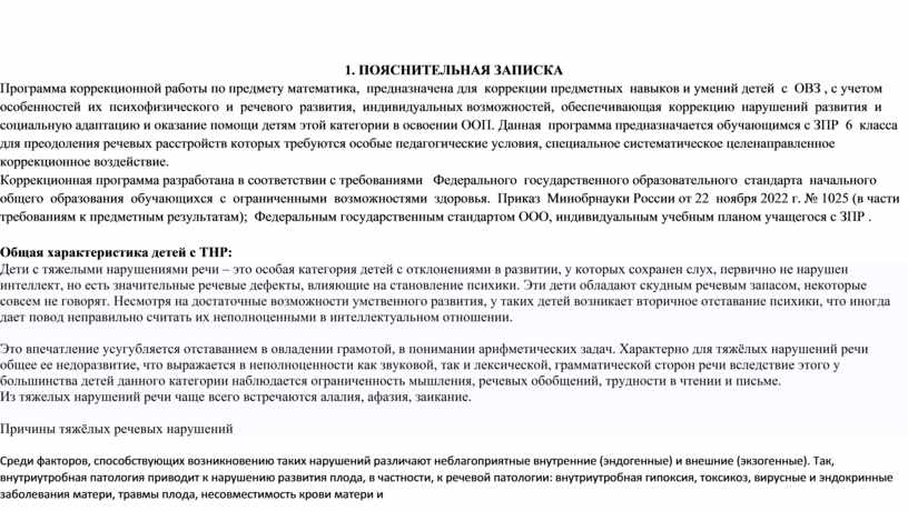 Коррекционная программа разработана в соответствии с требованиями Федерального государственного образовательного стандарта начального общего образования обучающихся с ограниченными возможностями здоровья. Приказ Минобрнауки России от 22 ноября 2022 г. № 1025 (в части требованиям к предметным результатам); Федеральным государственным стандартом ООО, индивидуальным учебным планом учащегося с ЗПР .