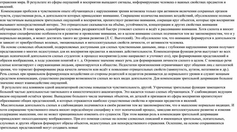 Нарушения зрения неоднозначно влияют на отдельные структурные компоненты личности, их компенсация рассматривается, как процесс перестройки психики и адаптации к новым условиям жизни. В основе механизма компенсации лежит приспособление организма, регулируемое ЦНС. Оно заключается в восстановлении или замещении нарушенных или утраченных функций организма независимо от того, где находится повреждение. Чем тяжелее дефект, тем большее количество систем организма включается в процесс компенсации. То есть, от тяжести дефекта зависит степень сложности механизмов компенсаторных явлений. Выпадение или нарушение зрительных функций при слепоте приводит к невозможности или затруднённости зрительного отражения мира. В результате из сферы ощущений и восприятия выпадают сигналы, информирующие человека о важных свойствах предметов и явлений.