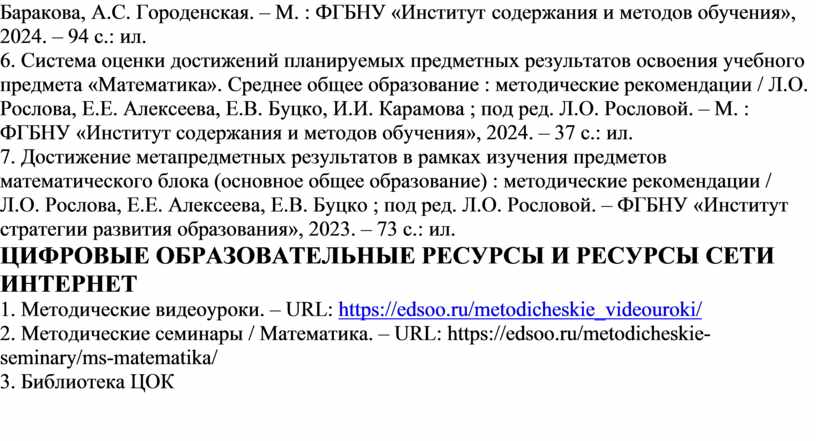 6. Система оценки достижений планируемых предметных результатов освоения учебного предмета «Математика». Среднее общее образование : методические рекомендации / Л.О. Рослова, Е.Е. Алексеева, Е.В. Буцко, И.И. Карамова ; под ред. Л.О. Рословой. – М. : ФГБНУ «Институт содержания и методов обучения», 2024. – 37 с.: ил.
