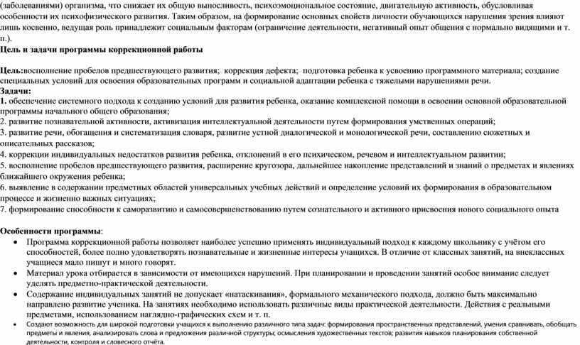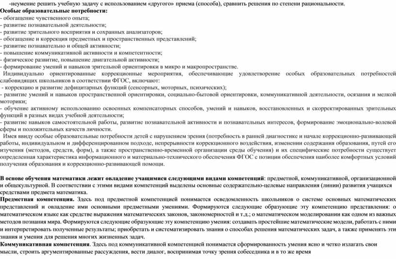Программа коррекционной работы по предмету математика, предназначена для коррекции предметных навыков и умений детей с ОВЗ , с учетом особенностей их психофизического и речевого развития, индивидуальных возможностей, обеспечивающая коррекцию нарушений развития и социальную адаптациюи оказание помощи детям этой категории в освоении ООП. Данная программа предназначается обучающимся с нарушением зрения для 6 класса , обучение которых требуются особые педагогические условия, специальное систематическое целенаправленное коррекционное воздействие.