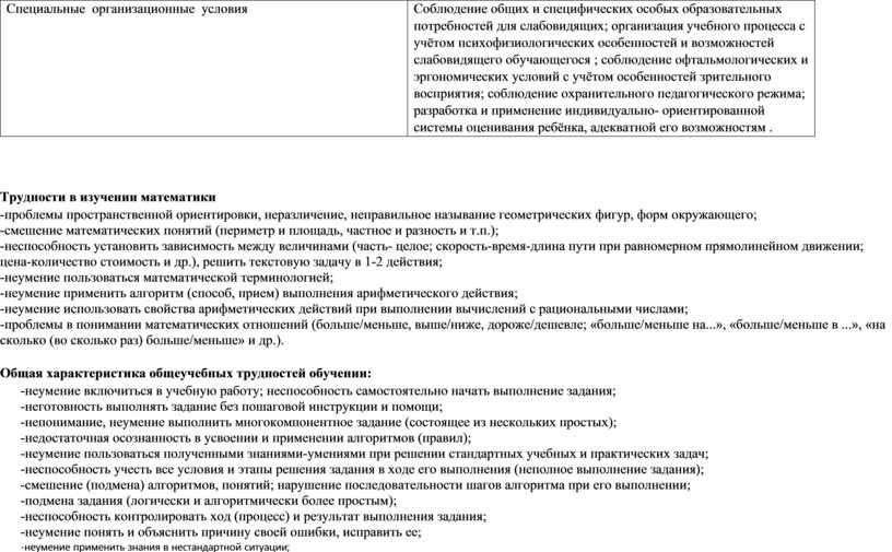 Соблюдение общих и специфических особых образовательных потребностей для слабовидящих; организация учебного процесса с учётом психофизиологических особенностей и возможностей слабовидящего обучающегося ; соблюдение офтальмологических и эргономических условий с учётом особенностей зрительного восприятия; соблюдение охранительного педагогического режима; разработка и применение индивидуально- ориентированной системы оценивания ребёнка, адекватной его возможностям . |