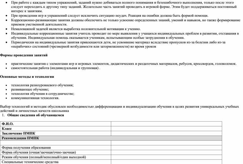 · Содержание индивидуальных занятий не допускает «натаскивания», формального механического подхода, должно быть максимально направлено развитие ученика. На занятиях необходимо использовать различные виды практической деятельности. Действия с реальными предметами, использованием наглядно-графических схем и т. п.