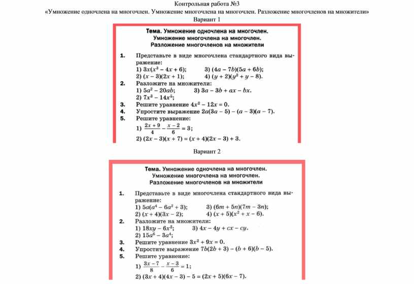 «Умножение одночлена на многочлен. Умножение многочлена на многочлен. Разложение многочленов на множители»