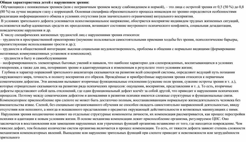 В условиях зрительного дефекта усиливается психоэмоциональное напряжение, обостряется восприятие индивидом трудных жизненных ситуаций, осложняется выбор адекватных средств их преодоления, возникают состояние внутреннего психического конфликта, социальная дезадаптация, поведенческие нарушения и др.