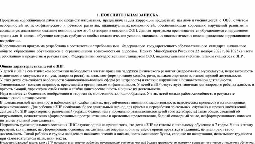 Коррекционная программа разработана в соответствии с требованиями Федерального государственного образовательного стандарта начального общего образования обучающихся с ограниченными возможностями здоровья. Приказ Минобрнауки России от 22 ноября 2022 г. № 1025 (в части требованиям к предметным результатам); Федеральным государственным стандартом ООО, индивидуальным учебным планом учащегося с ЗПР .