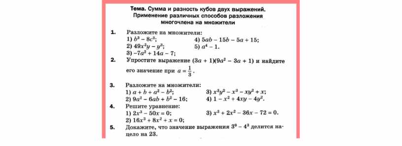 «Сумма и разность кубов двух выражений. Применение различных способов разложения многочлена на многочлен»