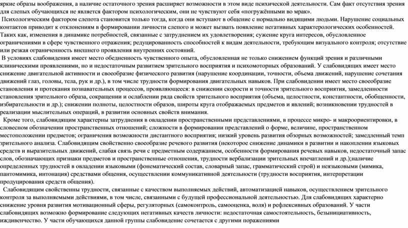 Слабовидящим свойственны трудности, связанные с качеством выполняемых действий, автоматизацией навыков, осуществлением зрительного контроля за выполняемыми действиями, в том числе, связанными с будущей профессиональной деятельностью. Для слабовидящих характерно снижение уровня развития мотивационный сферы, регуляторных (самоконтроль, самооценка, воля) и рефлексивных образований. У части слабовидящих возможно формирование следующих негативных качеств личности: недостаточная самостоятельность, безынициативность, иждивенчество. У части обучающихся данной группы слабовидение сочетается с другими поражениями (заболеваниями) организма, что снижает их общую выносливость, психоэмоциональное состояние, двигательную активность, обусловливая особенности их психофизического развития. Таким образом, на формирование основных свойств личности обучающихся нарушения зрения влияют лишь косвенно, ведущая роль принадлежит социальным факторам (ограничение деятельности, негативный опыт общения с нормально видящими и т. п.).