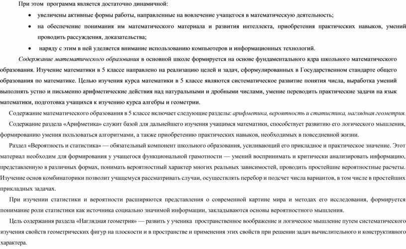 Содержание математического образования в 5 классе включает следующие разделы: арифметика, вероятность и статистика, наглядная геометрия.