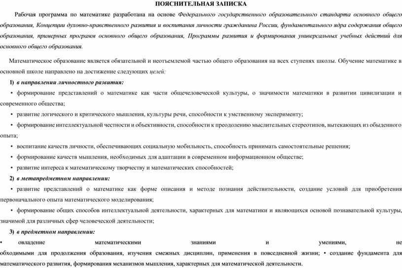 Рабочая программа по математике разработана на основе Федерального государственного образовательного стандарта основного общего образования, Концепции духовно-нравственного развития и воспитания личности гражданина России, фундаментального ядра содержания общего образования, примерных программ основного общего образования, Программы развития и формирования универсальных учебных действий для основного общего образования.