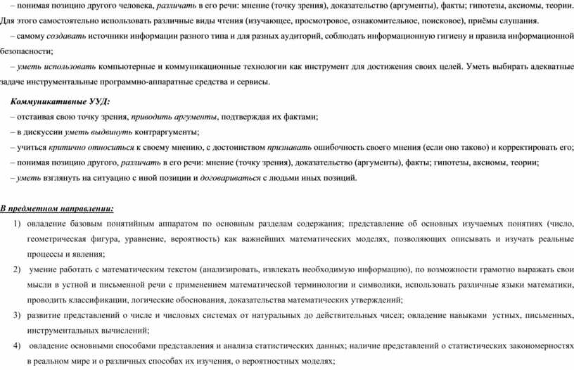 2) умение работать с математическим текстом (анализировать, извлекать необходимую информацию), по возможности грамотно выражать свои мысли в устной и письменной речи с применением математической терминологии и символики, использовать различные языки математики, проводить классификации, логические обоснования, доказательства математических утверждений;