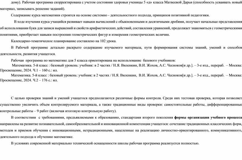 Согласно федеральному базисному учебному плану для общеобразовательных учреждений Российской Федерации на изучение математики отводится не менее 170 ч из расчета 6 ч в неделю в 5 классе. По базисному учебному плану МБОУ «Лицей № 28 г. Йошкар-Олы» на реализацию данной рабочей программы по математике отведено 102 ч из расчета 3 ч в неделю в 5 классе (обучение на дому). Рабочая программа скорректирована с учетом состояния здоровья ученицы 5 «д» класса Матвеевой Дарьи (способность усваивать новый материал, записывать решение заданий).