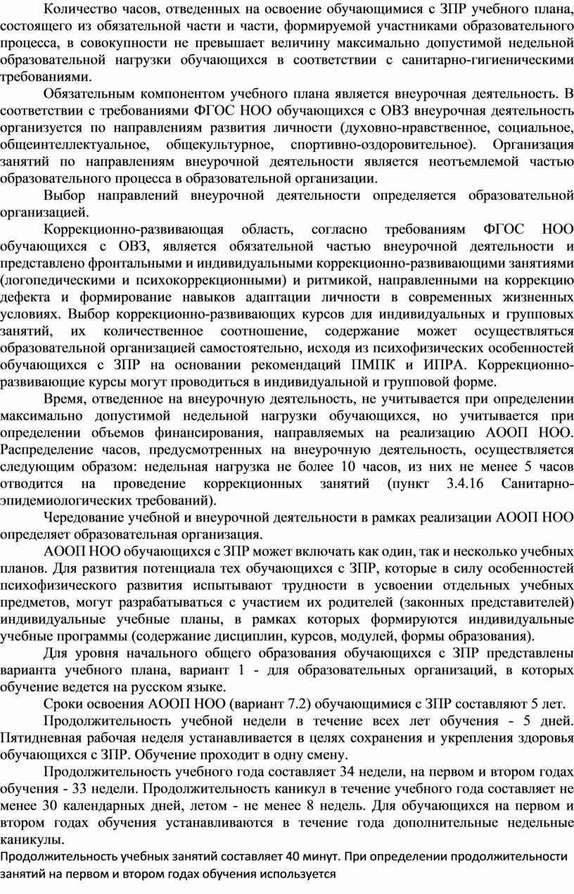 Количество часов, отведенных на освоение обучающимися с ЗПР учебного плана, состоящего из обязательной части и части, формируемой участниками образовательного процесса, в совокупности не превышает величину максимально допустимой недельной образовательной нагрузки обучающихся в соответствии с санитарно-гигиеническими требованиями.