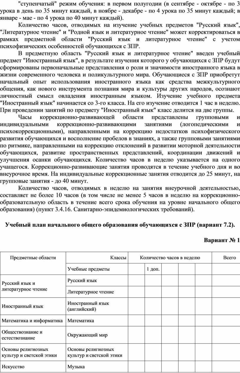 Учебный план начального общего образования обучающихся с ЗПР (вариант 7.2).