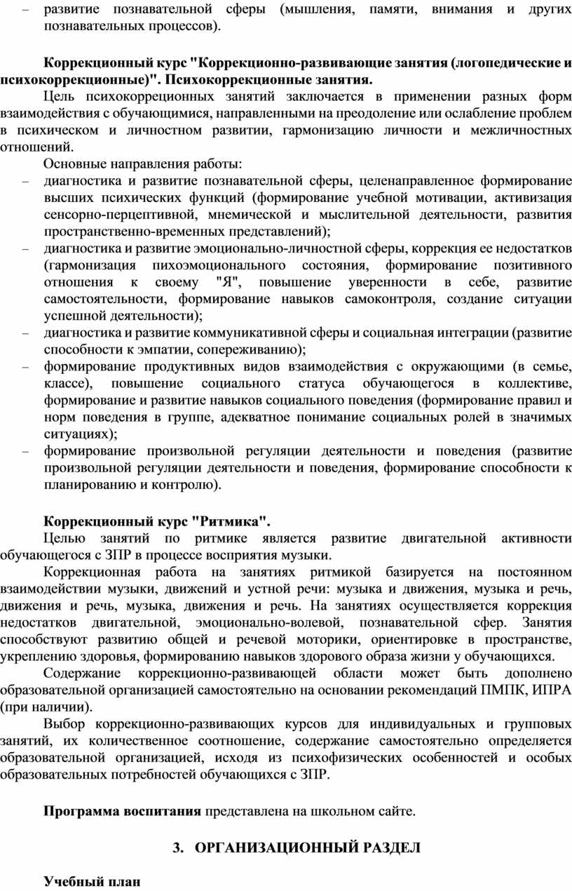 - на введение учебных курсов, обеспечивающих удовлетворение особых образовательных потребностей обучающихся с ЗПР и необходимую коррекцию недостатков в психическом и (или) физическом развитии;
