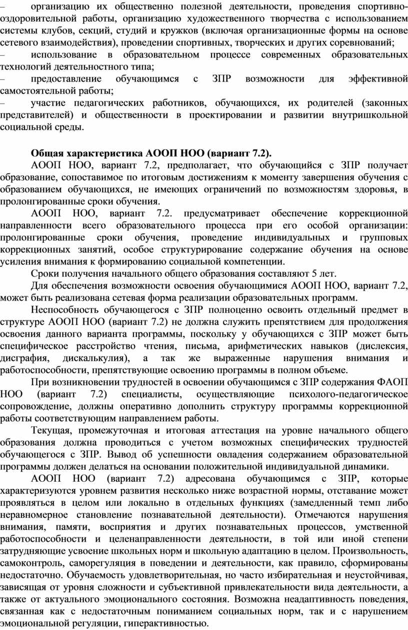 АООП НОО (вариант 7.2) адресована обучающимся с ЗПР, которые характеризуются уровнем развития несколько ниже возрастной нормы, отставание может проявляться в целом или локально в отдельных функциях (замедленный темп либо неравномерное становление познавательной деятельности). Отмечаются нарушения внимания, памяти, восприятия и других познавательных процессов, умственной работоспособности и целенаправленности деятельности, в той или иной степени затрудняющие усвоение школьных норм и школьную адаптацию в целом. Произвольность, самоконтроль, саморегуляция в поведении и деятельности, как правило, сформированы недостаточно. Обучаемость удовлетворительная, но часто избирательная и неустойчивая, зависящая от уровня сложности и субъективной привлекательности вида деятельности, а также от актуального эмоционального состояния. Возможна неадаптивность поведения, связанная как с недостаточным пониманием социальных норм, так и с нарушением эмоциональной регуляции, гиперактивностью.