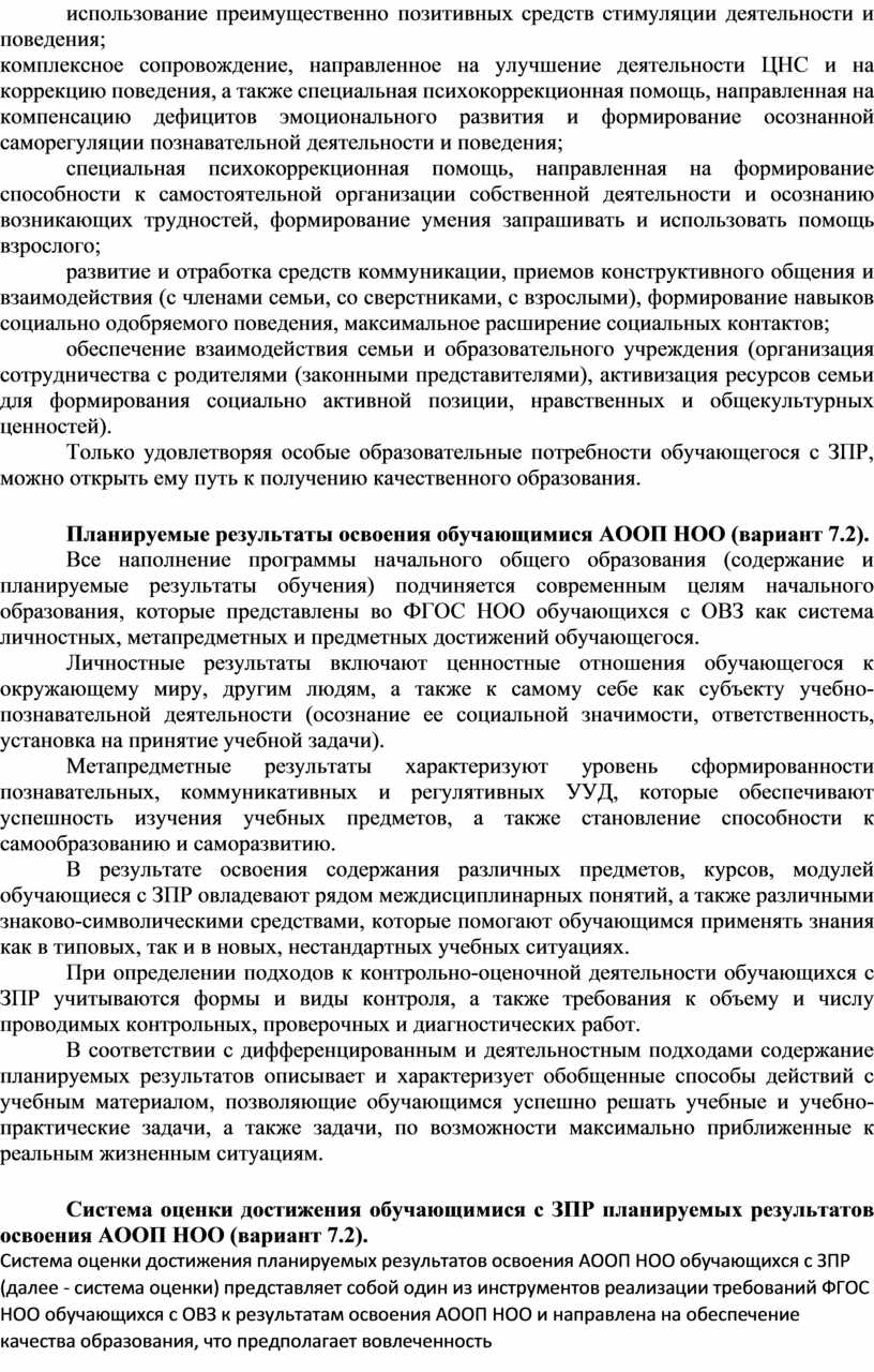 АООП НОО, вариант 7.2, предполагает, что обучающийся с ЗПР получает образование, сопоставимое по итоговым достижениям к моменту завершения обучения с образованием обучающихся, не имеющих ограничений по возможностям здоровья, в пролонгированные сроки обучения.