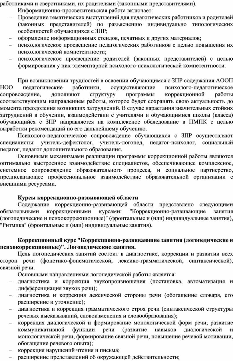 Коррекционно-развивающая область, согласно требованиям ФГОС НОО обучающихся с ОВЗ, является обязательной частью внеурочной деятельности и представлено фронтальными и индивидуальными коррекционно-развивающими занятиями (логопедическими и психокоррекционными) и ритмикой, направленными на коррекцию дефекта и формирование навыков адаптации личности в современных жизненных условиях. Выбор коррекционно-развивающих курсов для индивидуальных и групповых занятий, их количественное соотношение, содержание может осуществляться образовательной организацией самостоятельно, исходя из психофизических особенностей обучающихся с ЗПР на основании рекомендаций ПМПК и ИПРА. Коррекционно-развивающие курсы могут проводиться в индивидуальной и групповой форме.